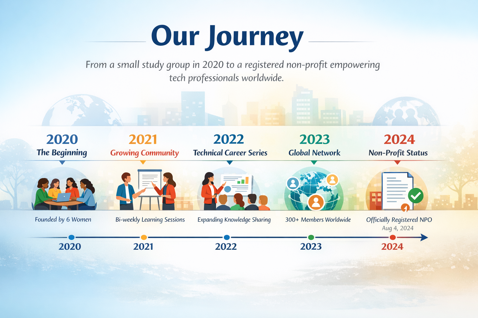 From a small study group in 2020 to a registered non-profit empowering tech professionals worldwide.